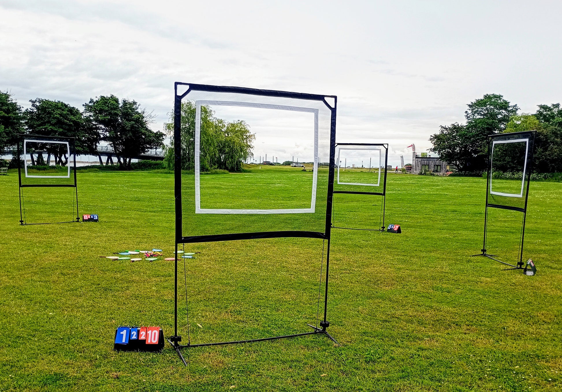 1 bane er 6 x 2,5 meter, svarende til badmintonbane på tværs og dermed plads til 3 baner på 1 badmintonbane. Det kan også sammenlignes med en parkeringsbås per bane, hvis der spilles på asfalt. Opsætningsvejledning medfølger.